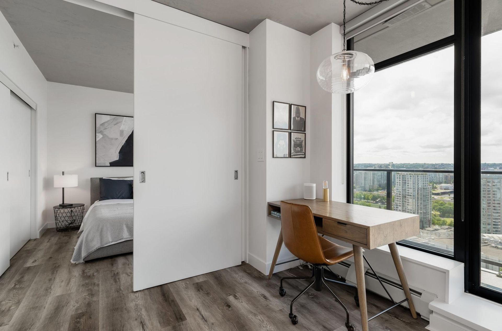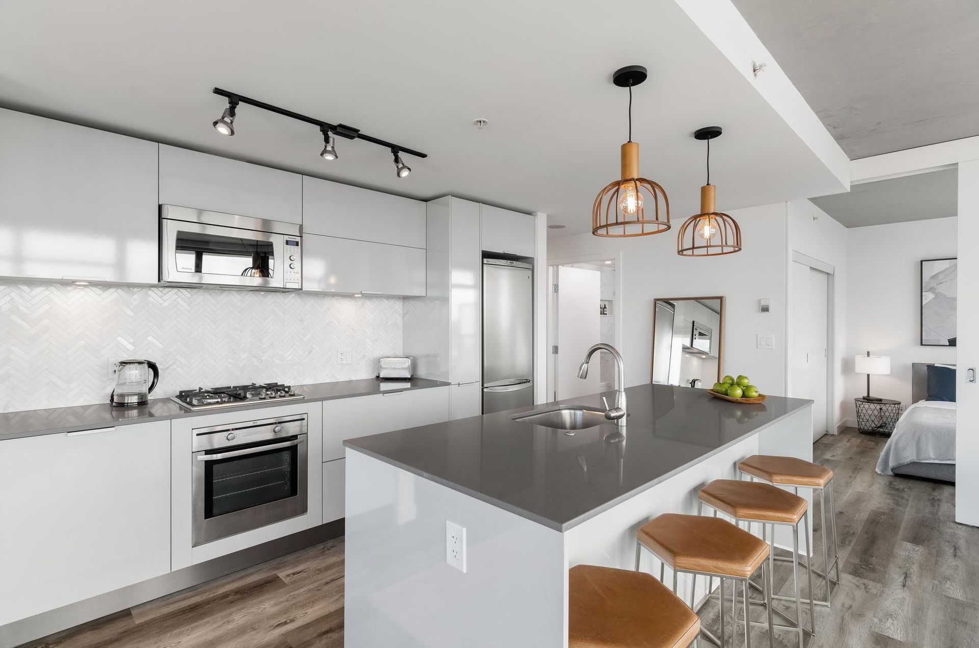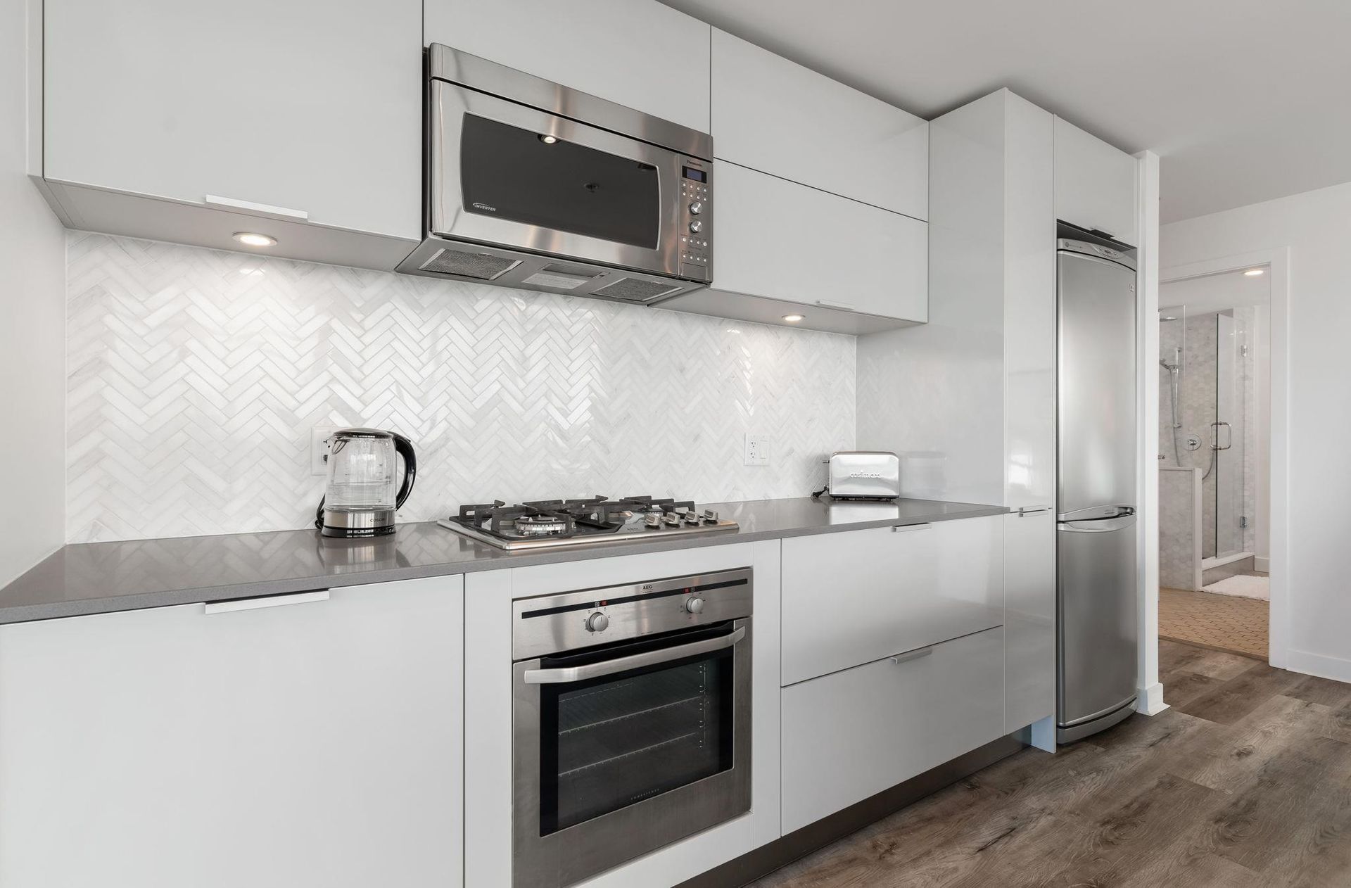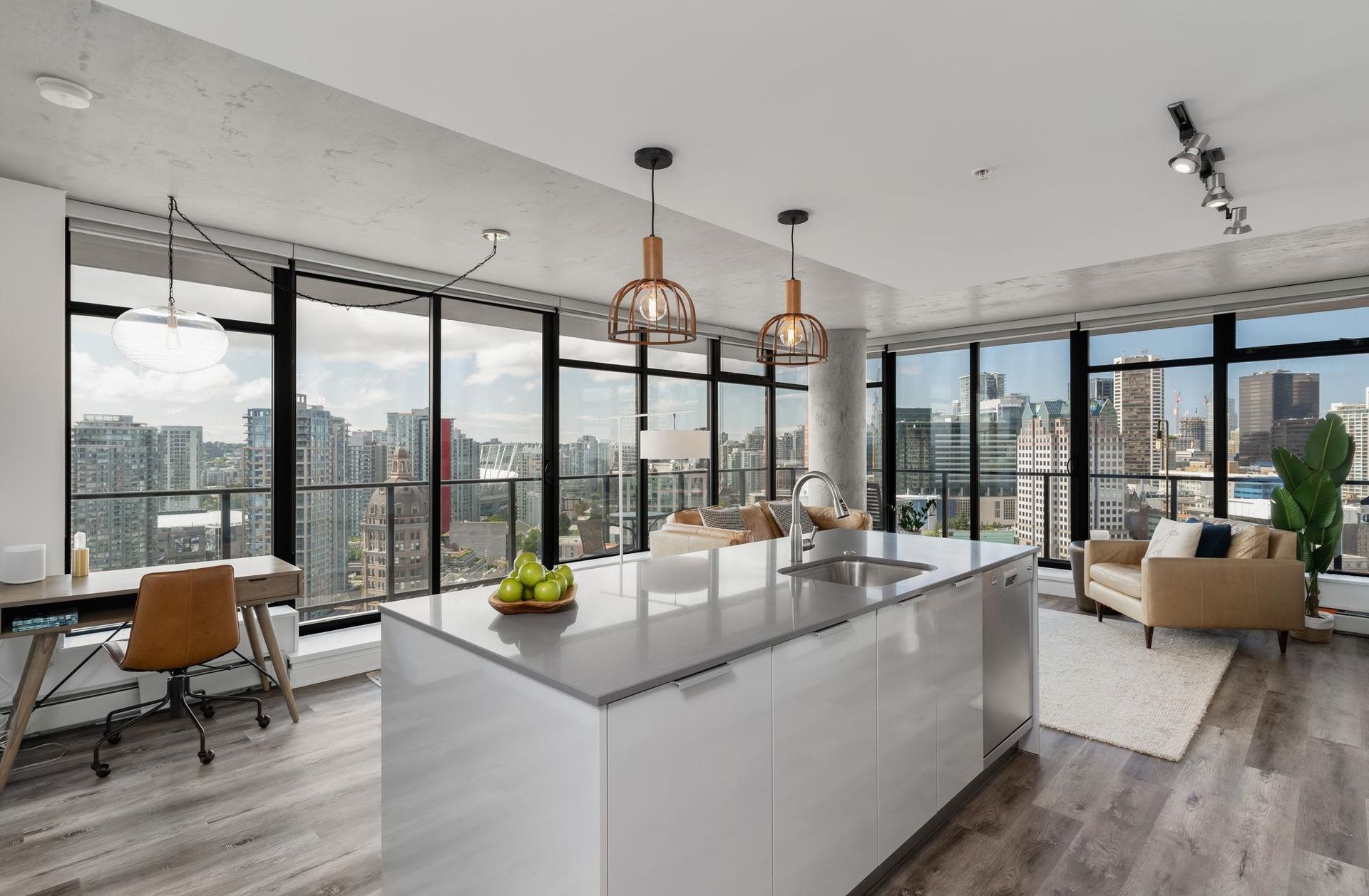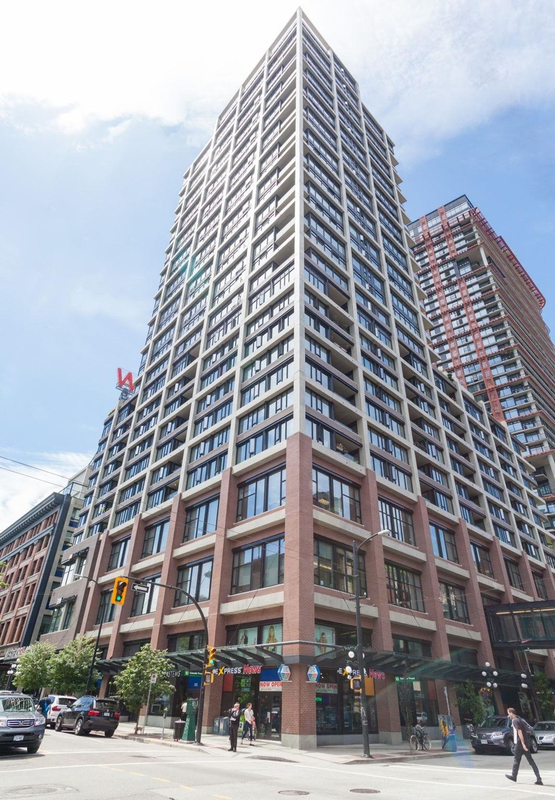 Take in sweeping City, Mountain & Water views from this bright & spacious corner unit at the iconic ‘Woodwards’ in Gastown. With 764 sqft of well designed living space & a generous 241 sqft wraparound balcony, this 1 bed/1bath home is fully equipped with: floor-to-ceiling windows flooding the unit with natural light, polished concrete throughout, modern kitchen w s/s appliances, spa-like 4 piece bathroom with ample counter space, standalone shower & soaker tub, & in-suite laundry. New floors, backsplash & fixtures. Residents have access to top-tier amenities: Concierge, rooftop: fitness centre, lounge/dining/meeting area, hot tub, terrace. Steps to Nesters, cafes, restaurants, transit/skytrain, & more. 1 secure underground parking (not leased)! Pets and rentals welcome.