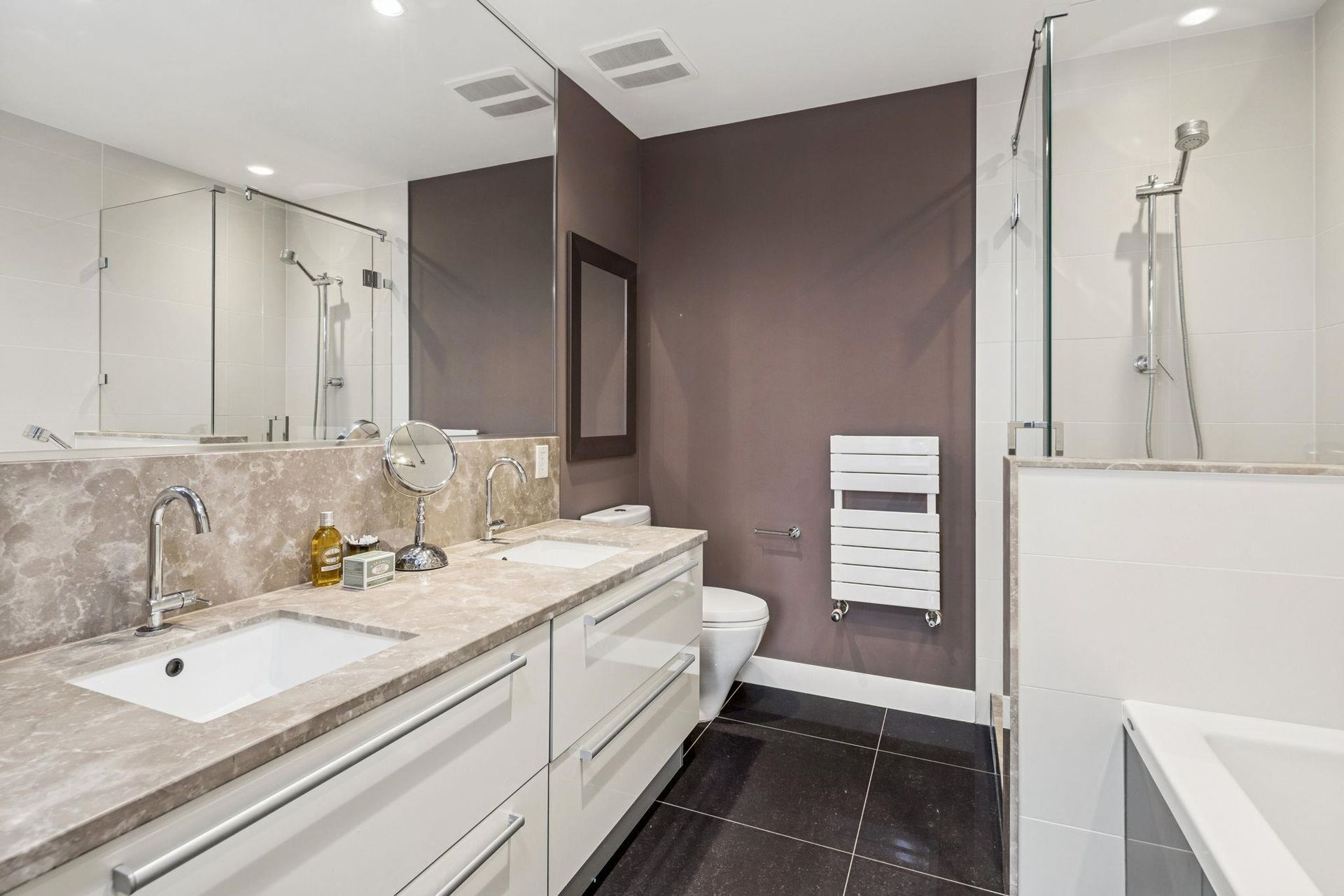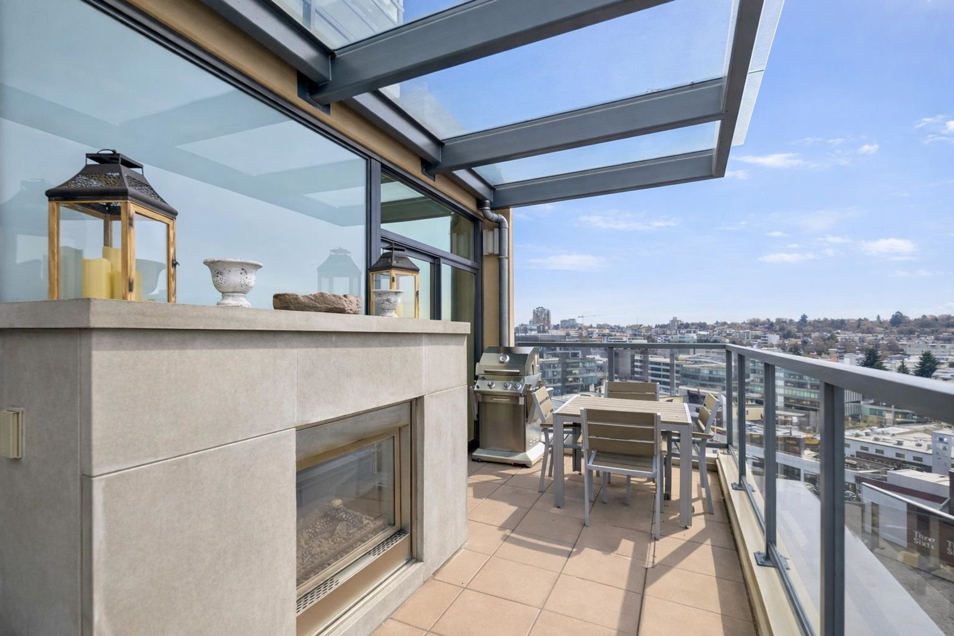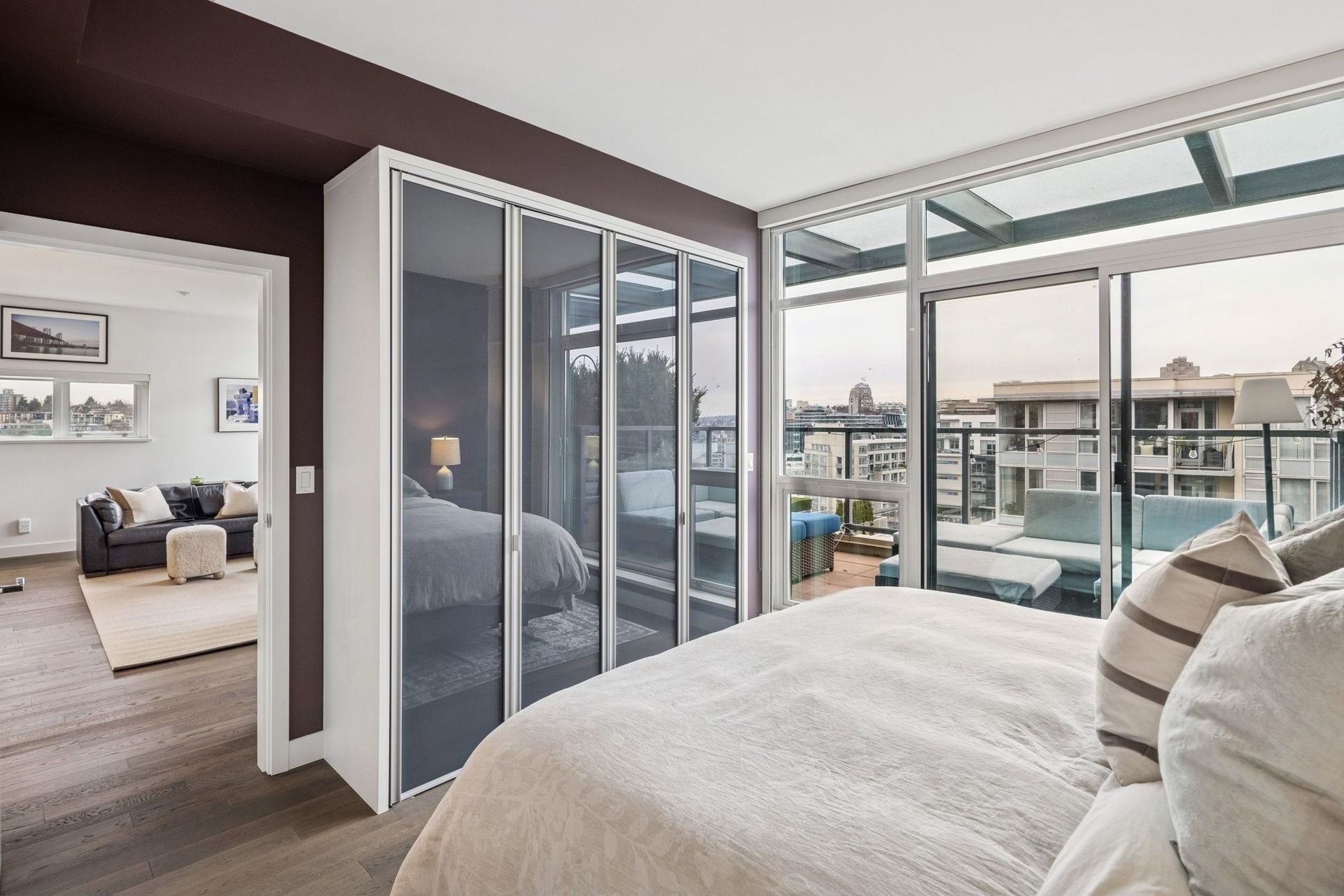 Luxurious 2 BED, 2 BATH + DEN w/ WATER VIEWS at 'The James' by Cressey offers 1,271 sqft of thoughtfully designed, expansive interior living. Feat. incl, sleek hardwood flooring, high-end S/S & Miele appliances, A/C, radiant in-floor heating, 2 integrated beverage fridges, custom millwork, extensive in-suite storage & primary walk-in closet, & a dedicated pantry. Floor-to-ceiling windows provide western exposure with open views of Downtown, False Creek, and Mount Pleasant. A massive private terrace w/ a gas fireplace creates an exceptional extension of the living space, ideal for entertaining. Incl. 2 side by side parking stalls w/ EV capability, concierge, gym & rooftop terrace & lounge w/ BBQ area. Impeccably maintained, steps to the seawall & endless restaurants + cafes. A true gem.