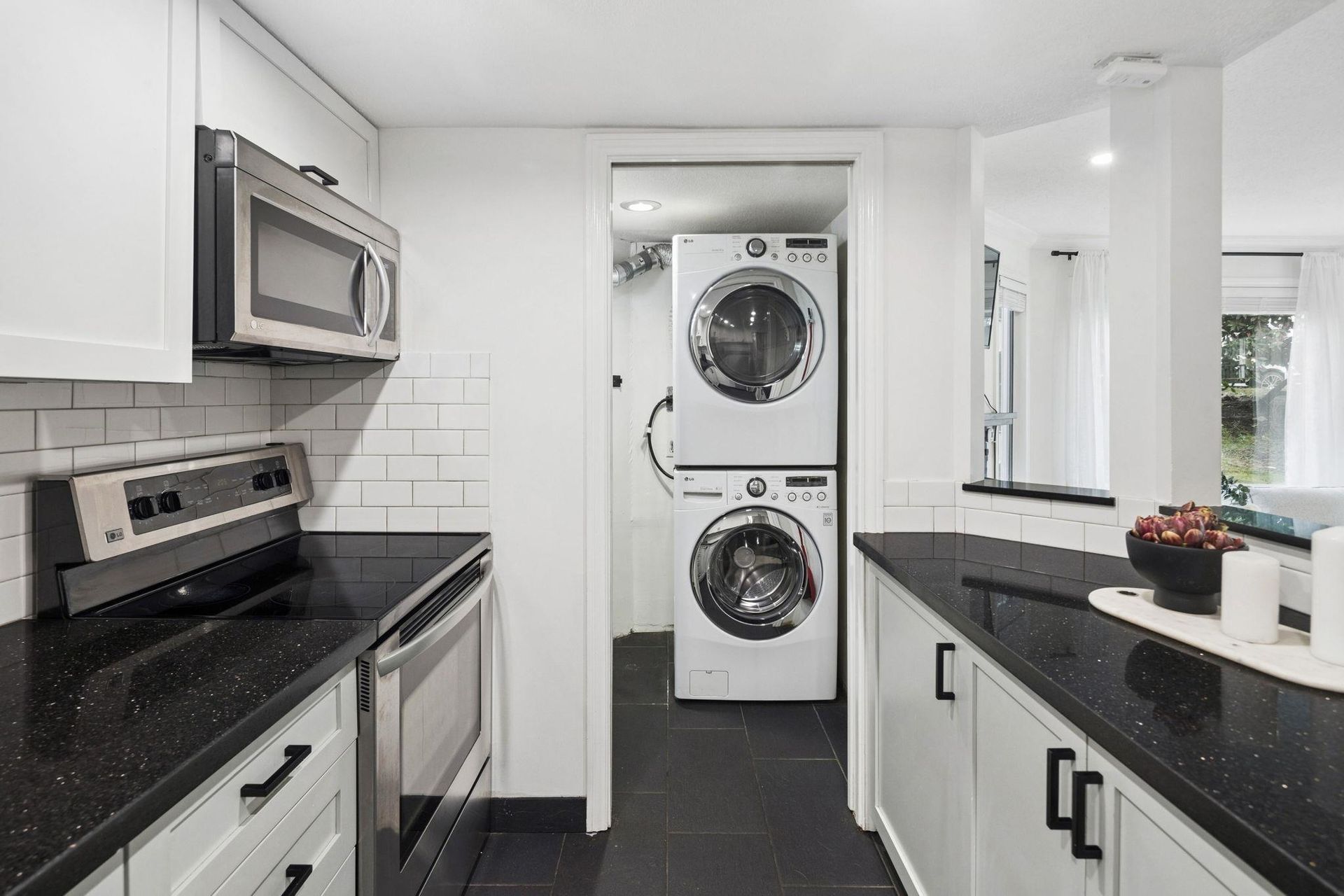 Welcome to this charming 1 bed+1 bath 772 sqft home in the heart of Lower Lonsdale. Perfect for entertaining, this spacious corner unit offers an exceptional layout w updated flooring, kitchen & bathroom. The expansive living room is anchored by a cozy gas fireplace. Large windows flood the home w natural light enhancing the airy feel of the generous floor plan which easily accommodates a full dining area & large living room furniture. Thoughtful details include a large pantry w in-suite laundry & mudroom-style entry for coats/storage. The oversized primary bedroom has ample room for a king sized bed & additional furniture w custom built-ins throughout. Dreamy location - just steps to the Shipyards, Seabus, restaurants, & fitness boutiques. Parking &storage included.Pets & rentals welcome.