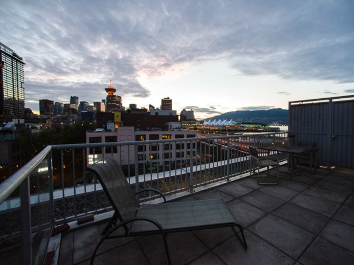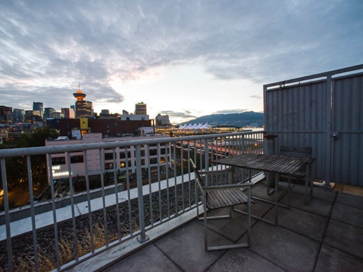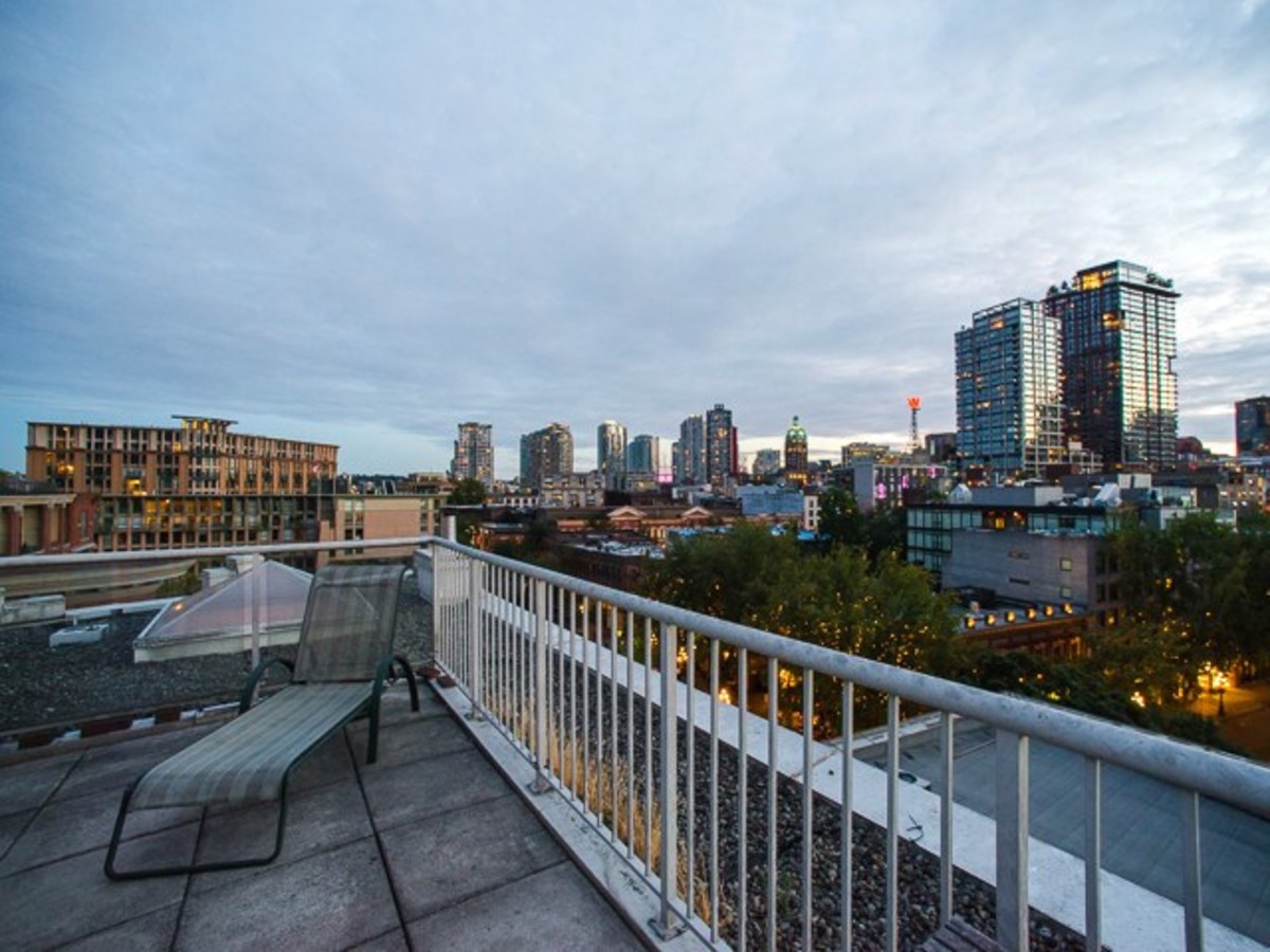 One-of-a-kind penthouse loft in arguably the most desirable location in Gastown. This unique city home offers over 700sqft of living space, in addition to a private rooftop deck that perches above the Gastown city lights with direct views over the Burrard Inlet, towards the North Shore Mountains. This southwest corner home offers an efficient floor plan with a galley style kitchen leading to a large living space, featuring soaring vaulted ceilings, expansive windows and a 4'x4' skylight. Separated sleeping area complete with ample storage. Some of the other unique features include exposed concrete walls, gas fireplace, insuite laundry and 1 secured underground parking spot. Both pets and rentals are permitted.