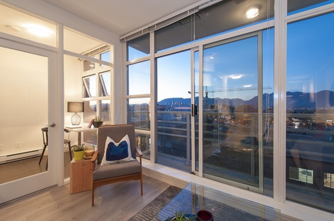 THE SOPHIA - Stunning expansive views from this trendy large one bedroom & den located in Mount Pleasant/Main Street area! Conveniently located next to a multitude of restaurants and shops as well as Elementary Schools for those with children and just a stone's throw away from the downtown core - all accessible by rapid public transport. Quality concrete built building offering underground parking , large bike room, a lounge and playground. Everything you need in a 1 bedroom with in-suite storage, large den for an office and modern kitchen overlooking generous living room with a fireplace. 1 parking & 1 storage locker included.