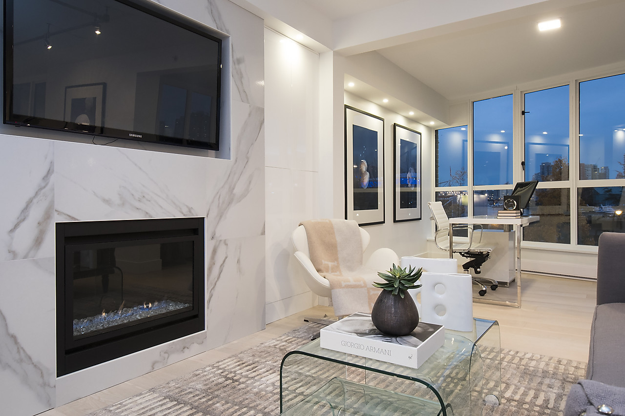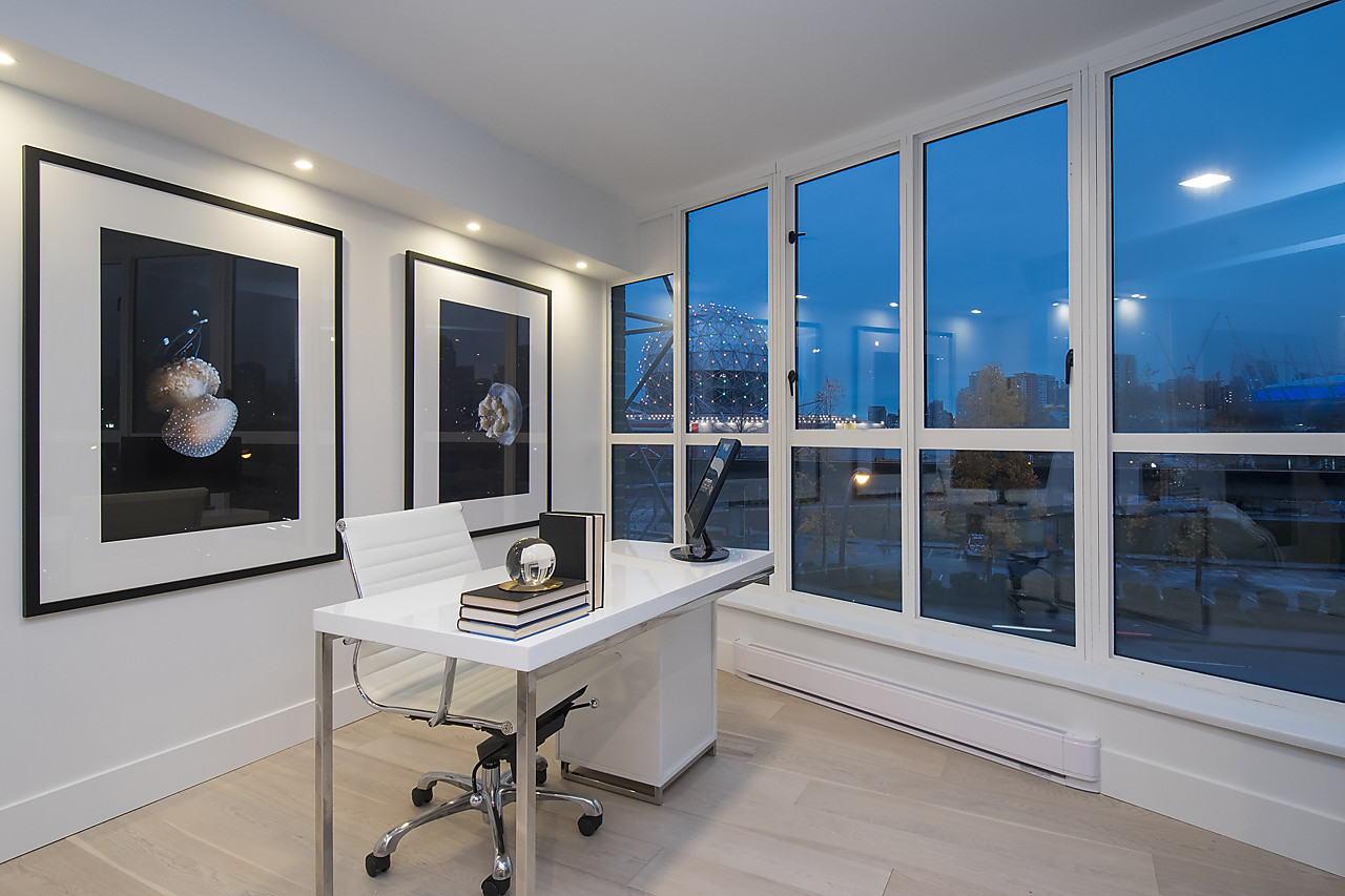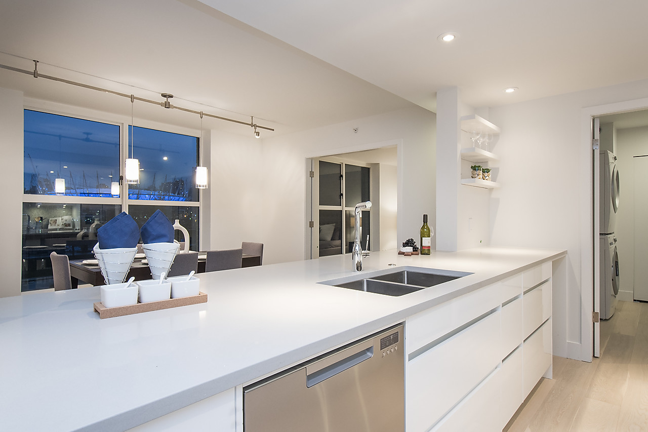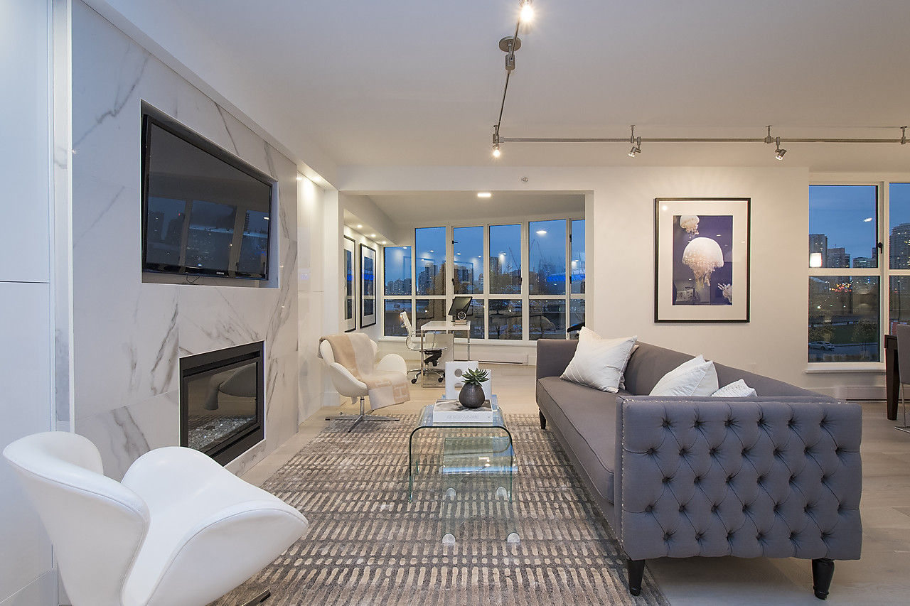 Citygate by Bosa now hosts a staggeringly beautiful 1,745 sqft completely renovated masterpiece. This home has been remodelled with over 180K worth of upgrades with the utmost attention to detail.The large master bedroom emits a luxury hotel feel with a spa-like ensuite fit with Italian porcelain tile, a glass shower and Hytec modern bathtub, as well as a custom lighted make-up vanity. The generous open plan kitchen boasts new countertops, soft close cabinetry and all new Fisher & Paykel appliances, including two dishwasher drawers and a 38 bottle wine cooler! You can enjoy sitting in the stunning living room with a new fireplace fit with white marble tiles and built-in white lacquer shelving, all overlooking the breathtaking view of Science World and False Creek ocean views.