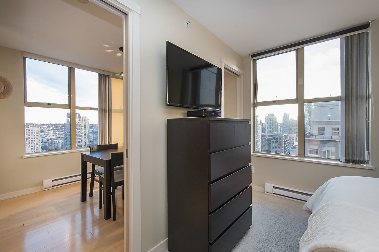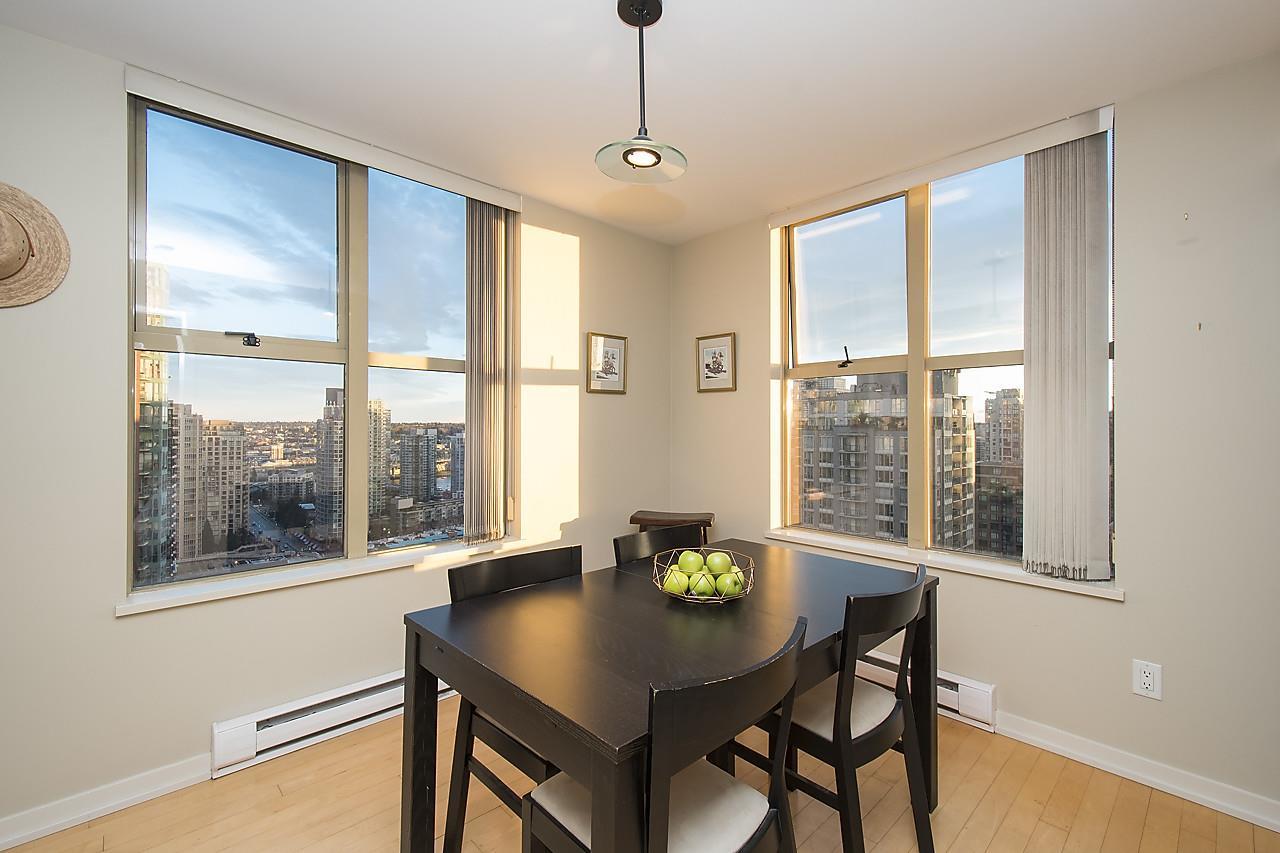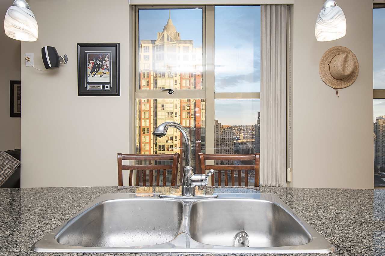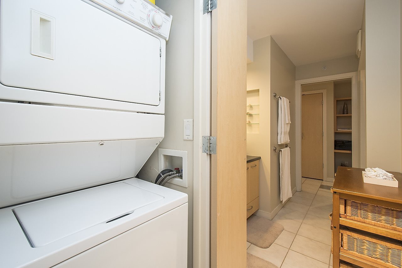 Here is one of the BEST 1 bed + den units in the Bosa built Mondrian buildings. Incredibly bright & sunny southeast facing floorplan high up on the 23rd floor! Pictures do not do justice to the expansive water and city views over Yaletown and False Creek. At 635sqft, this unit has every aspect you could need. Large kitchen & generous bathroom, office space AND an extra den for storage, as well as 1 parking & storage underground. Amenities include a hot tub, steam room, gym, lounge, garden, guest suites + caretaker. 1 pet & rentals allowed. Very easy to show!