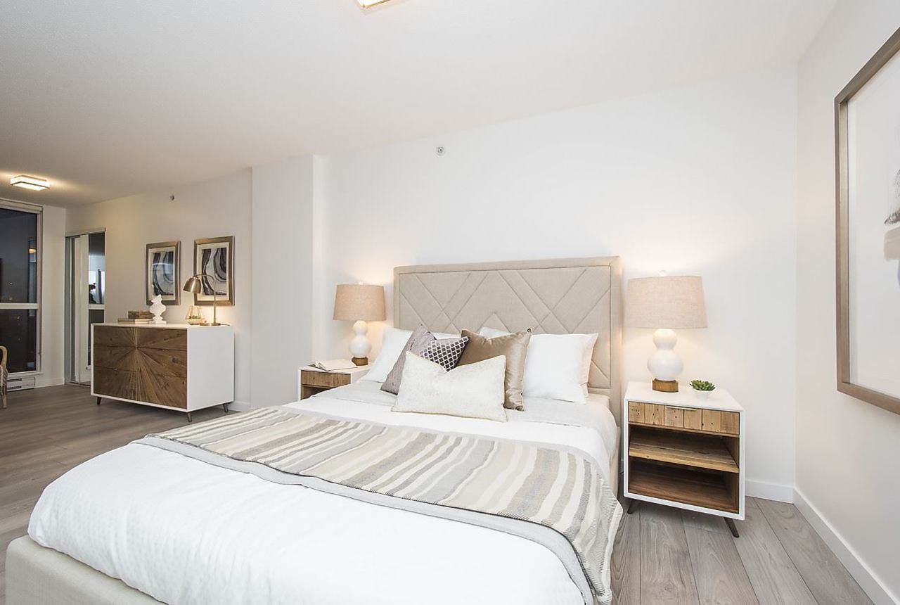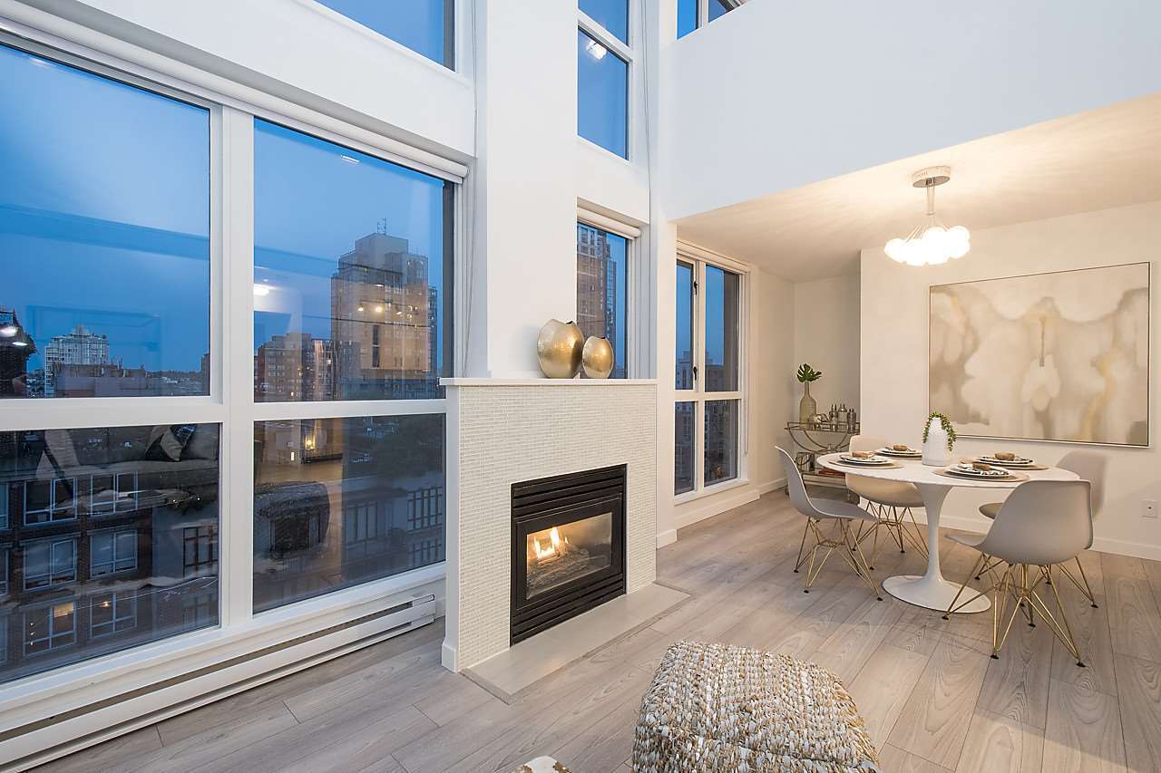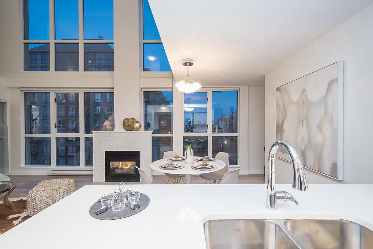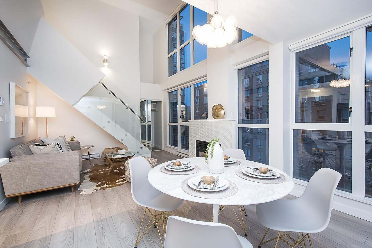 Rarely Available 1 bed/2bath loft in Metropolis! This remarkable 2-Level Loft has been completely remodelled from top to bottom, with double height, floor to ceiling windows overlooking Yaletown and peek a boo views of the water. The open concept floorpan is perfect for the entertainers out there offering enough space to have a large dining room table and a cozy living room next to the fireplace. Upstairs, the spacious master bedroom overlooks the living area below and includes an area to create an office nook or dressing area and tons of closet space. Amenities include a large gym, roof top garden and hot tub. Located steps from the sea wall and everything Yaletown has to offer! Includes 1 parking stall. Rentals/Pets allowed. OPEN HOUSE SAT/SUN 2-4PM May 5/6.