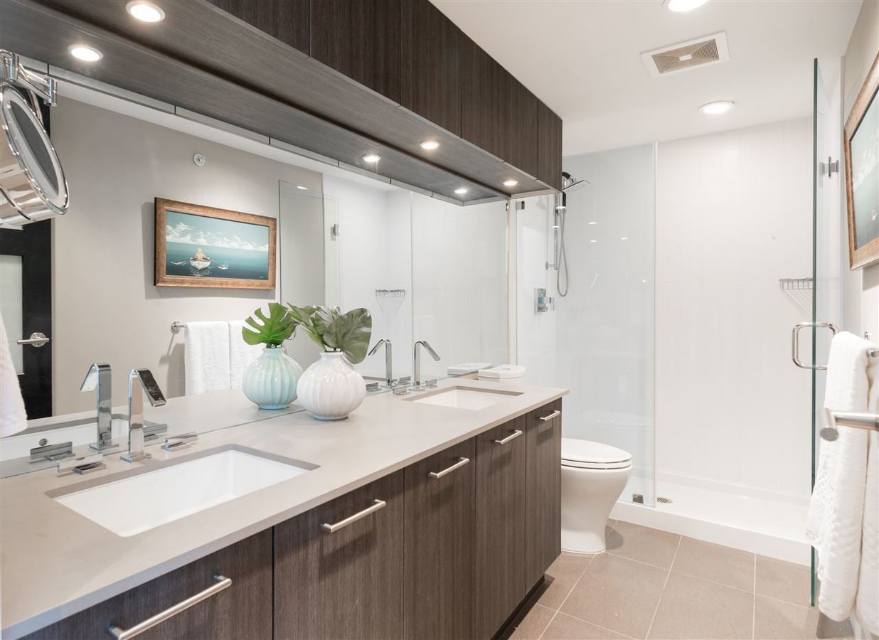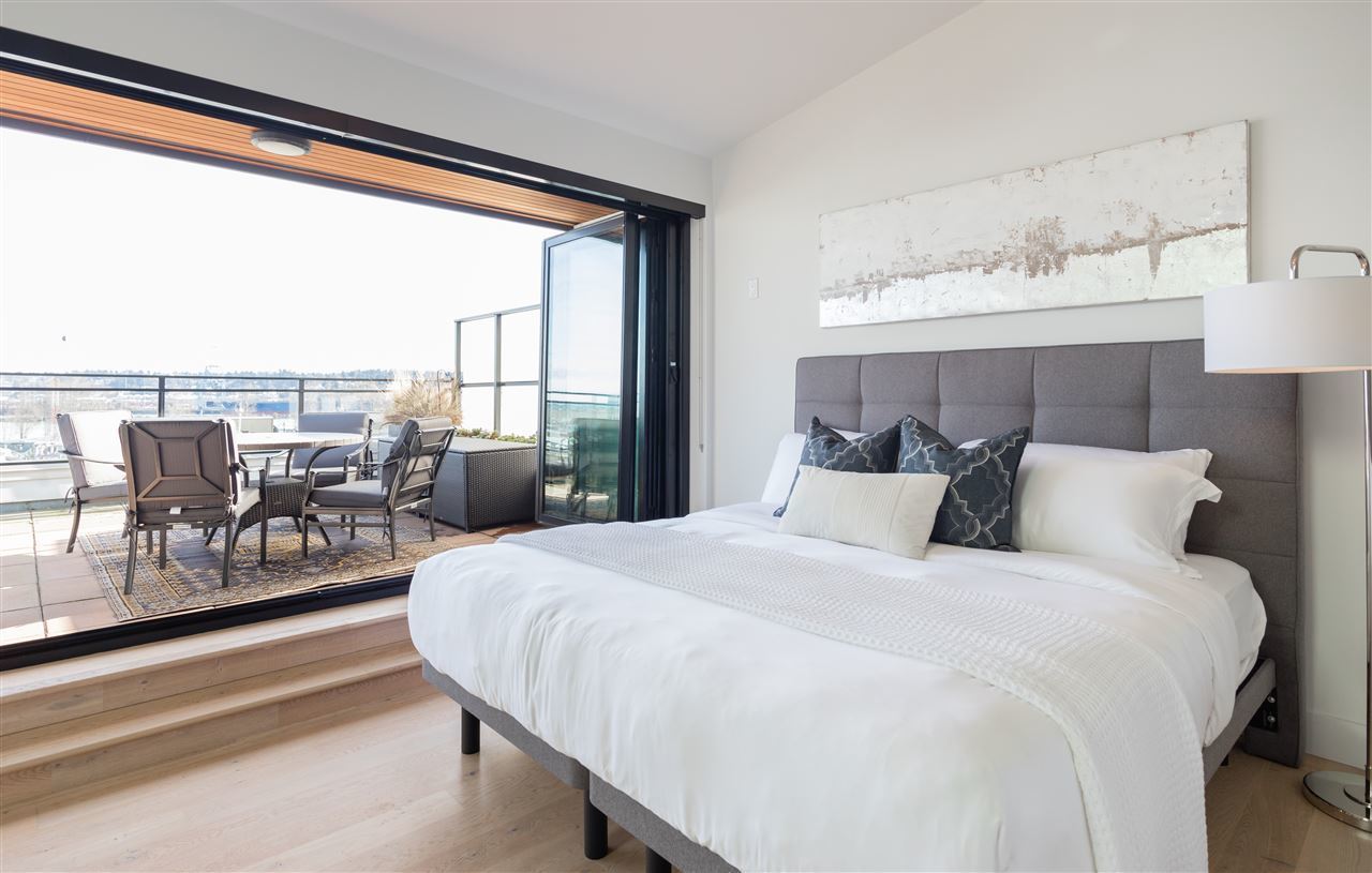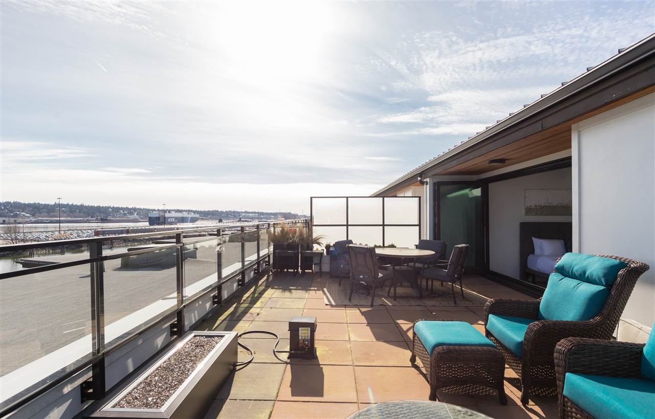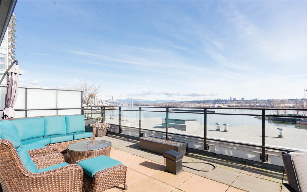 Welcome to the GLASSHOUSE LOFTS by ARAGON. This unique PENTHOUSE loft space is truly special with 3 beds, 2 baths, 20 ft. ceilings, exposed RECLAIMED BRICK feature wall & white oak engineered hardwood flooring. The contemporary kitchen boasts travertine countertops, Kohler fixtures, a gas cooktop and overlooks your spacious dining/living room. Upstairs you will enjoy a modern folding glass wall system in your master bed that opens up to a 500 sf rooftop terrace w/ gas fireplace and stunning water/mountain views. This property is truly equipped to make the most of living in the lower mainland. Only 20 mins to Van, 10 mins to Richmond and 2 mins to the diverse range of amenities. Walk along the 1.7km of serene riverfront & future pedestrian bridge! 2 parking/ 1 storage, pets & rentals ok.