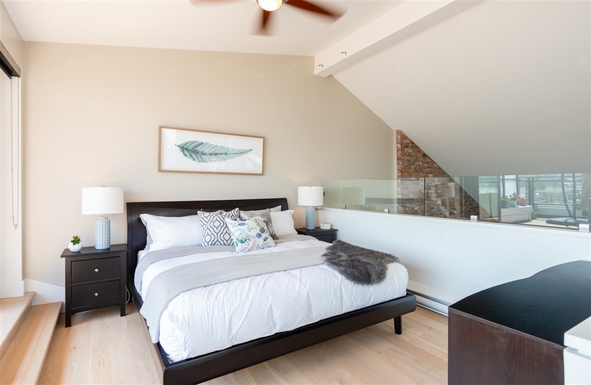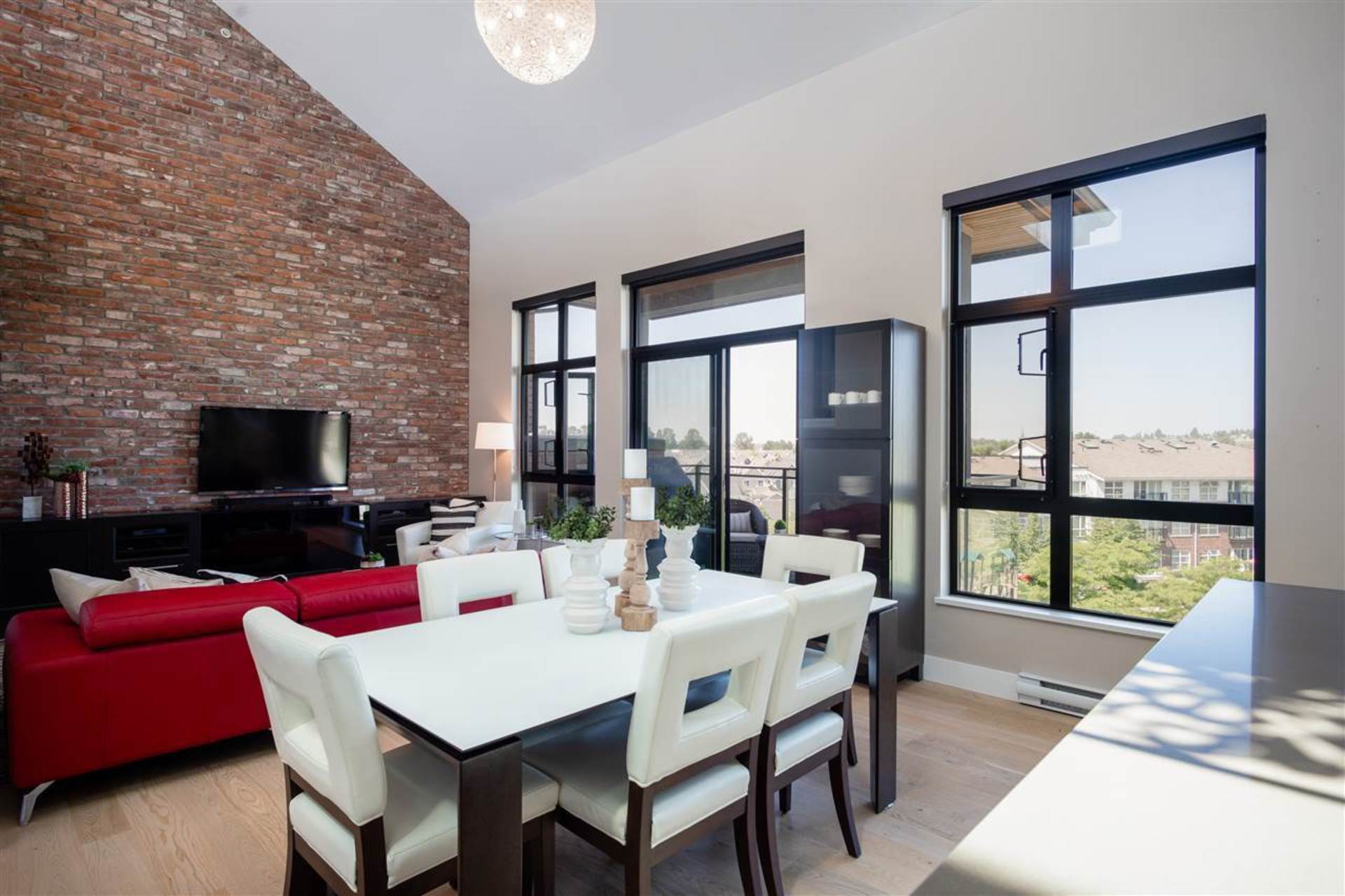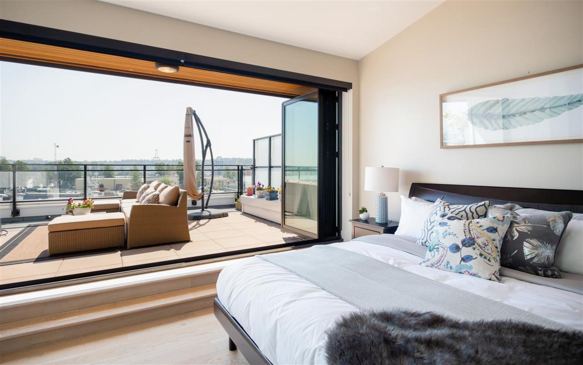 Welcome to the GLASSHOUSE LOFTS by ARAGON. This unique PENTHOUSE loft space is truly special with 3 beds, 2 baths, 20 ft. ceilings, exposed RECLAIMED BRICK feature wall & white oak engineered hardwood flooring. The contemporary kitchen boasts quartz countertops, Kohler fixtures, a gas cooktop and overlooks your spacious dining/living room. Upstairs you will enjoy a modern folding glass wall system in your master bed that opens up to a 500 sf rooftop terrace w/ gas fireplace and stunning water/mountain views. This property is truly equipped to make the most of living in the lower mainland. Only 20 mins to Van, 10 mins to Richmond and 2 mins to the diverse range of amenities. Walk along the 1.7km of serene riverfront or enjoy the NEW FERRY outside your door. 2 parking/ 1 storage.