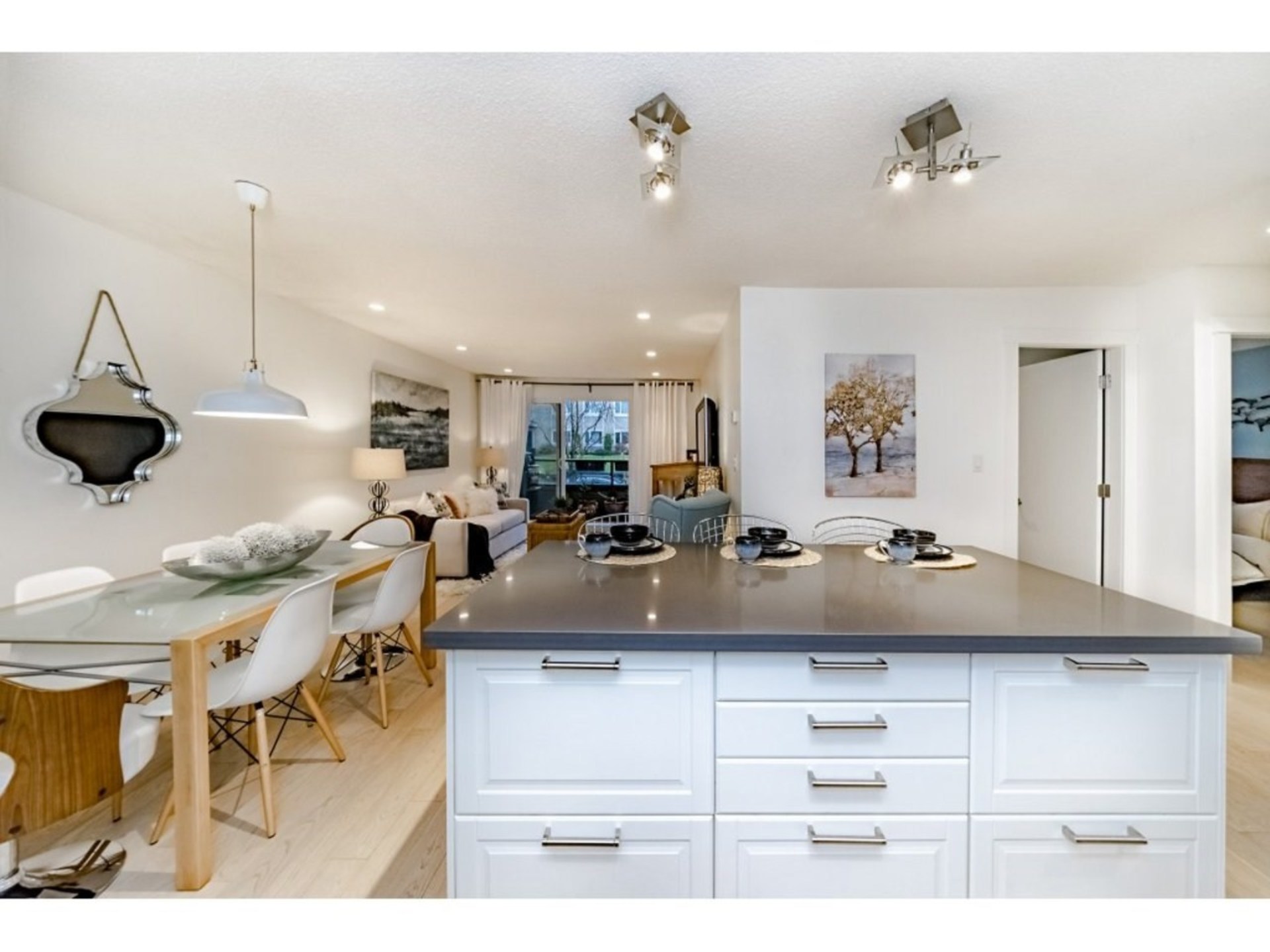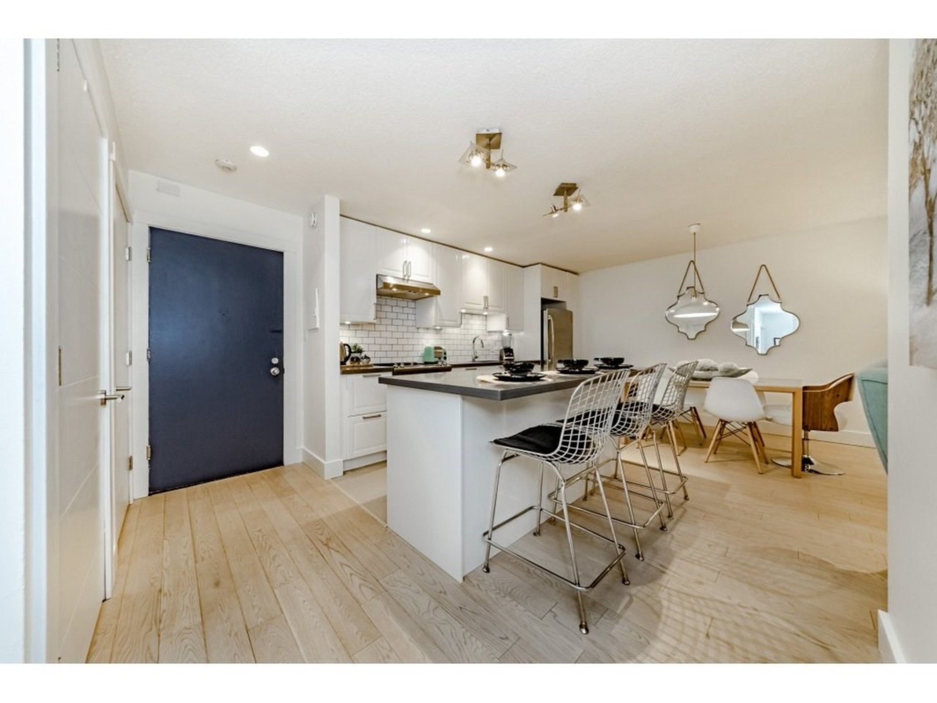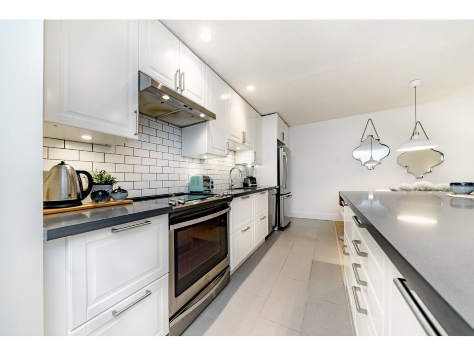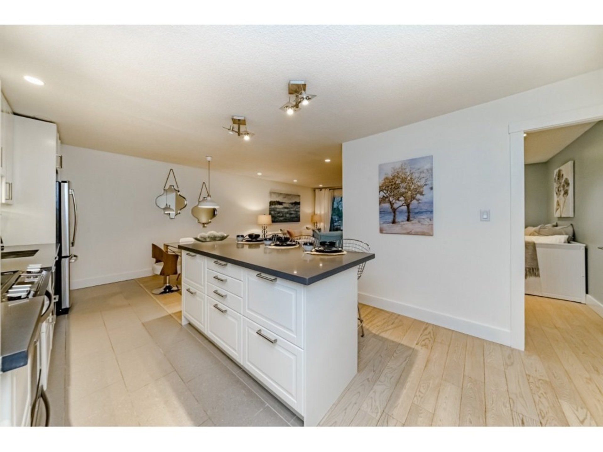 Beautifully RENOVATED 840 SF 2 bdrm in Fairmont Place a sought after building & neighborhood. OPEN CONCEPT large white modern kitchen with extra storage overlooks a big quartz island facing your dining/living and walk out to south facing balcony. Boasting, oak eng/wood & porcelain tile flooring, soft close cabinets with extra pull outs, pot lights, SS appliances. Master bdrm walk in closet w/built ins and private balcony. The spa bathrm w/soaker tub, rainshower, sleek double sink & storage. Building virtually new with Full rainscreen, balconies, roof, windows, sliders, full elevator upgrade 2013, new boilers & repiped 2008, new wash/dryer 2016. 1 parking 1 storage, pets allowed. Unit roughed in for in-suite laundry!