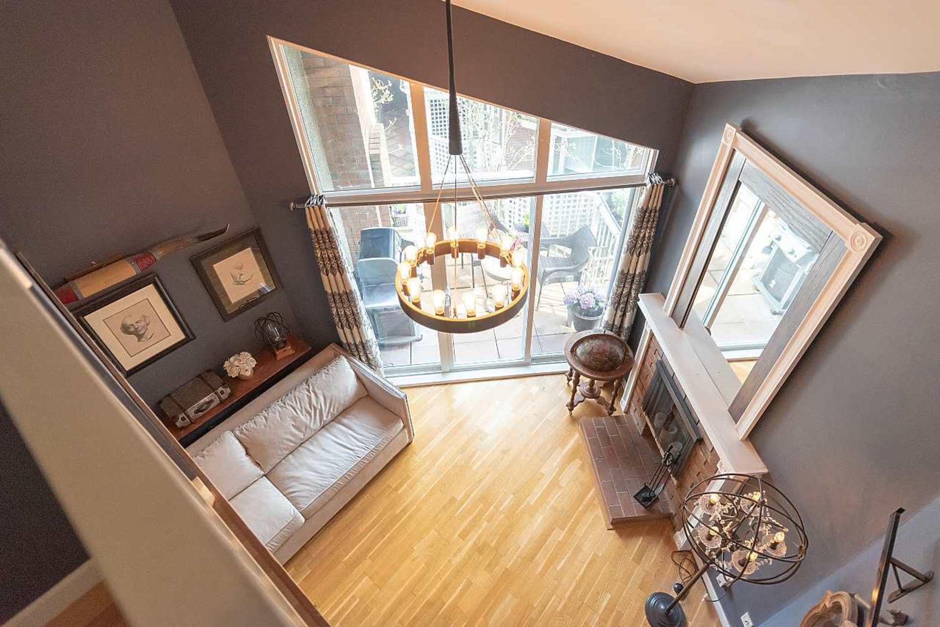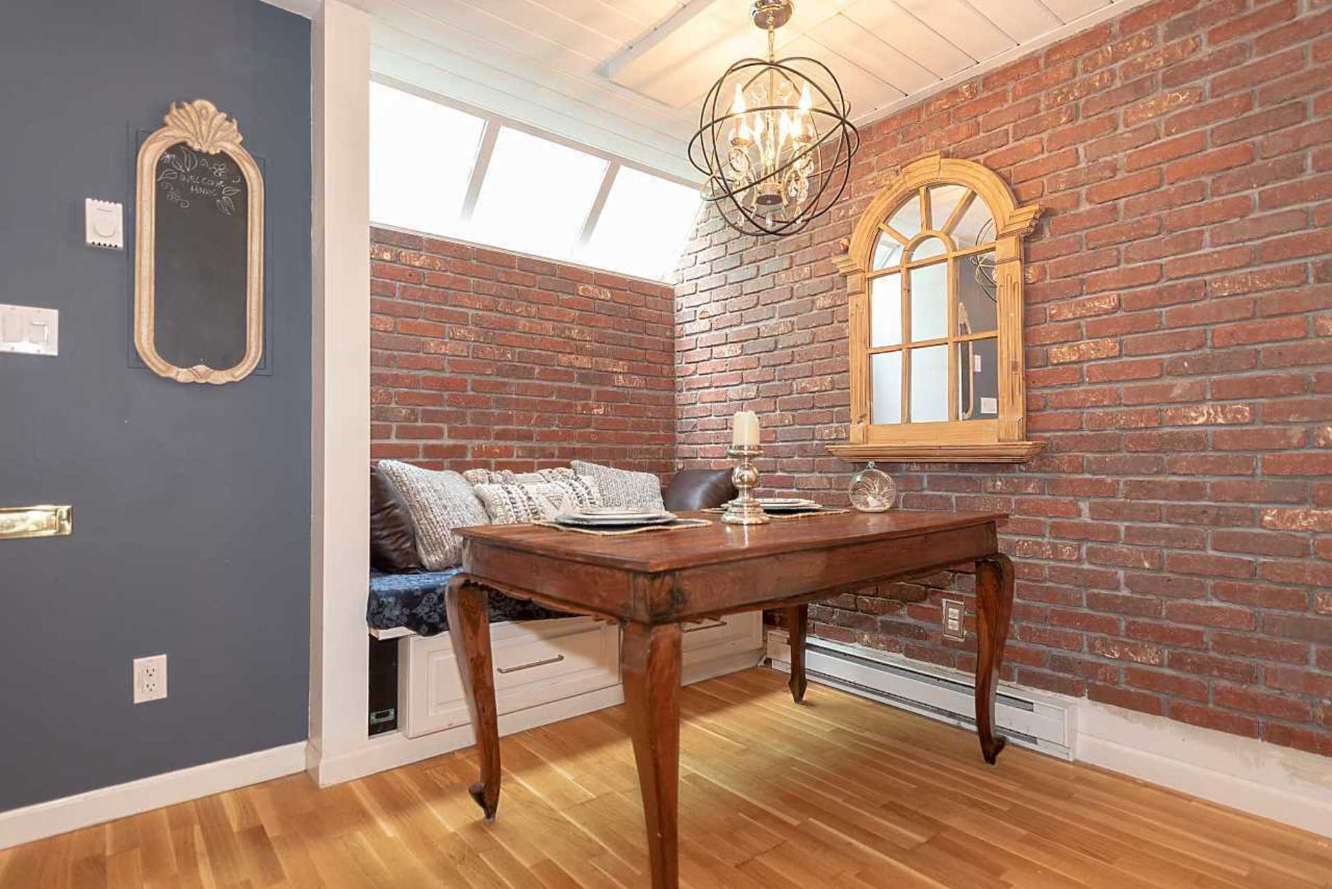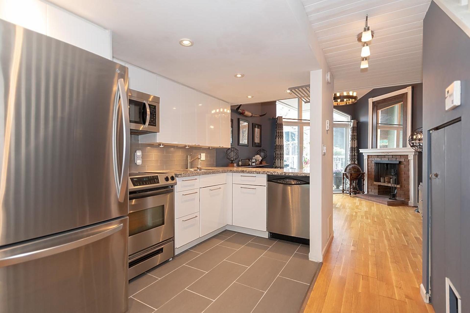 Welcome to Greenwood Place. This quiet, 2 level townhouse has many unique upgrades and you will feel at home the moment you enter. The open floorplan features a dining area surrounded by charming brick walls. The kitchen awaits with stainless steel appliances, granite counter tops, updated backsplash and tile floor. Sit by the cozy wood burning fireplace in your living room, under a vaulted ceiling. Enjoy a morning coffee or summer BBQ on the private balcony. Upstairs the bedroom has vaulted ceilings, a large closet and juliet balcony. Renovated bathroom has in floor heating and spa like tub/shower. The office loft space offers views to the living room and outside. Parking for 2 cars and a storage room are included.