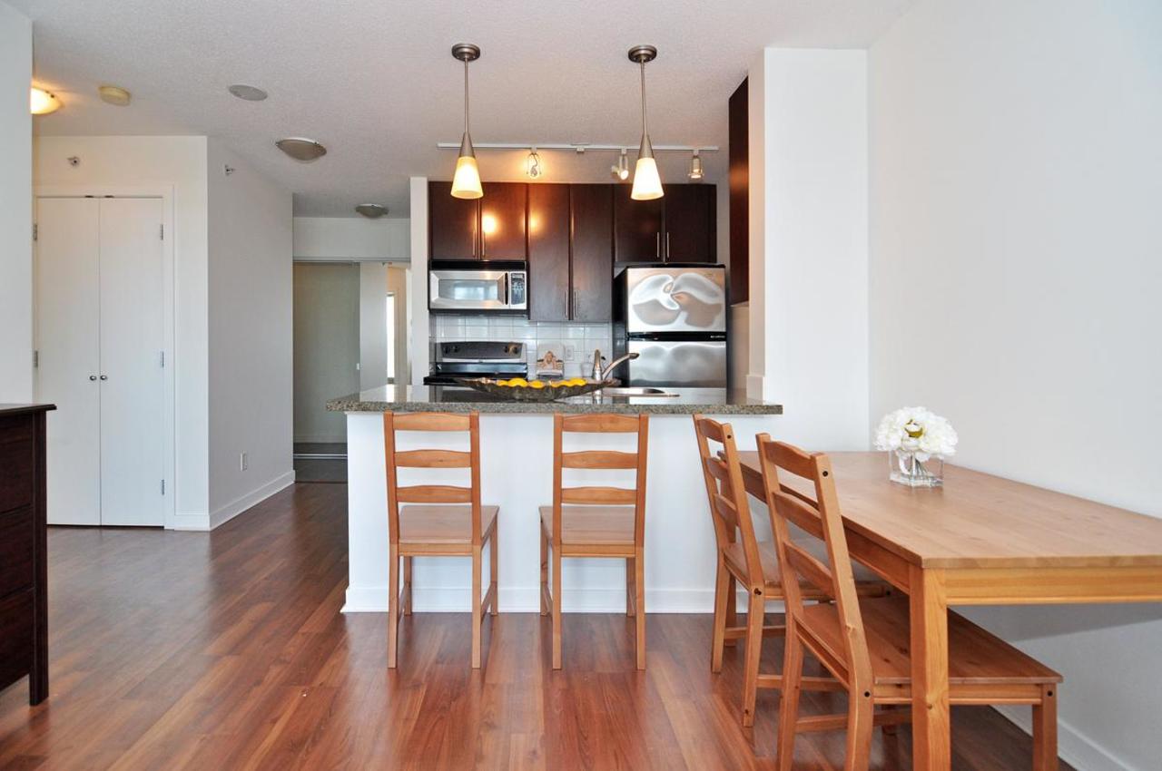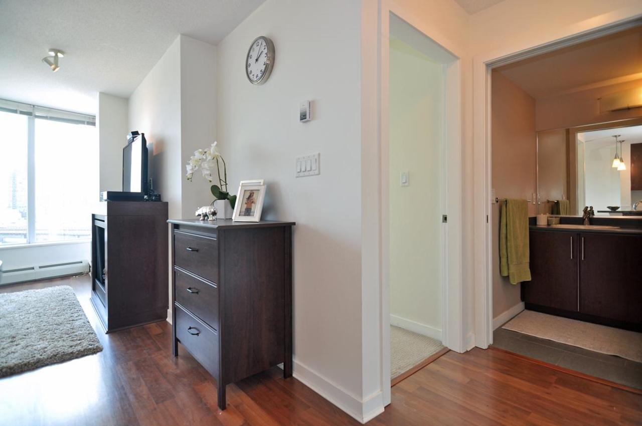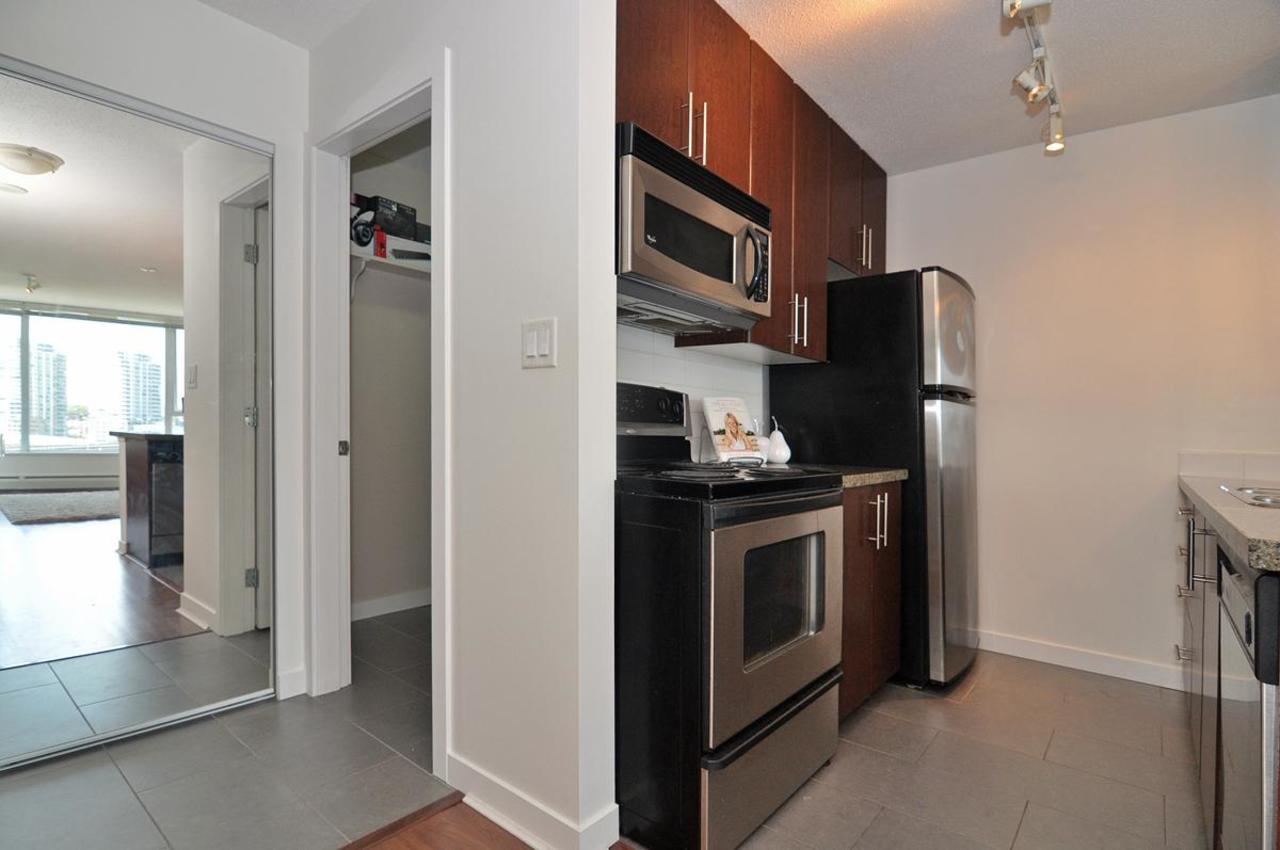 FIRENZE TOWER TWO by Henderson Development- a beautiful 1 bed/1 bath & den located in the heart of downtown. This bright South facing unit has sweeping views of False Creek and features an efficient, functional floor plan thatincludes an open galley style kitchen with granite counter tops and stainless appliances. The tower hosts a wide range of amenities including full indoor lap pool & hot tub, fitness centre, theatre room, sauna, underground parking & a bike room! Convenient Crosstown location, steps to the Sky-train (Stadium Station), Seawall, Costco, T&T Supermarket and International Village. 1 parking and 1 bike storage included. Pets and rentals are welcomed!