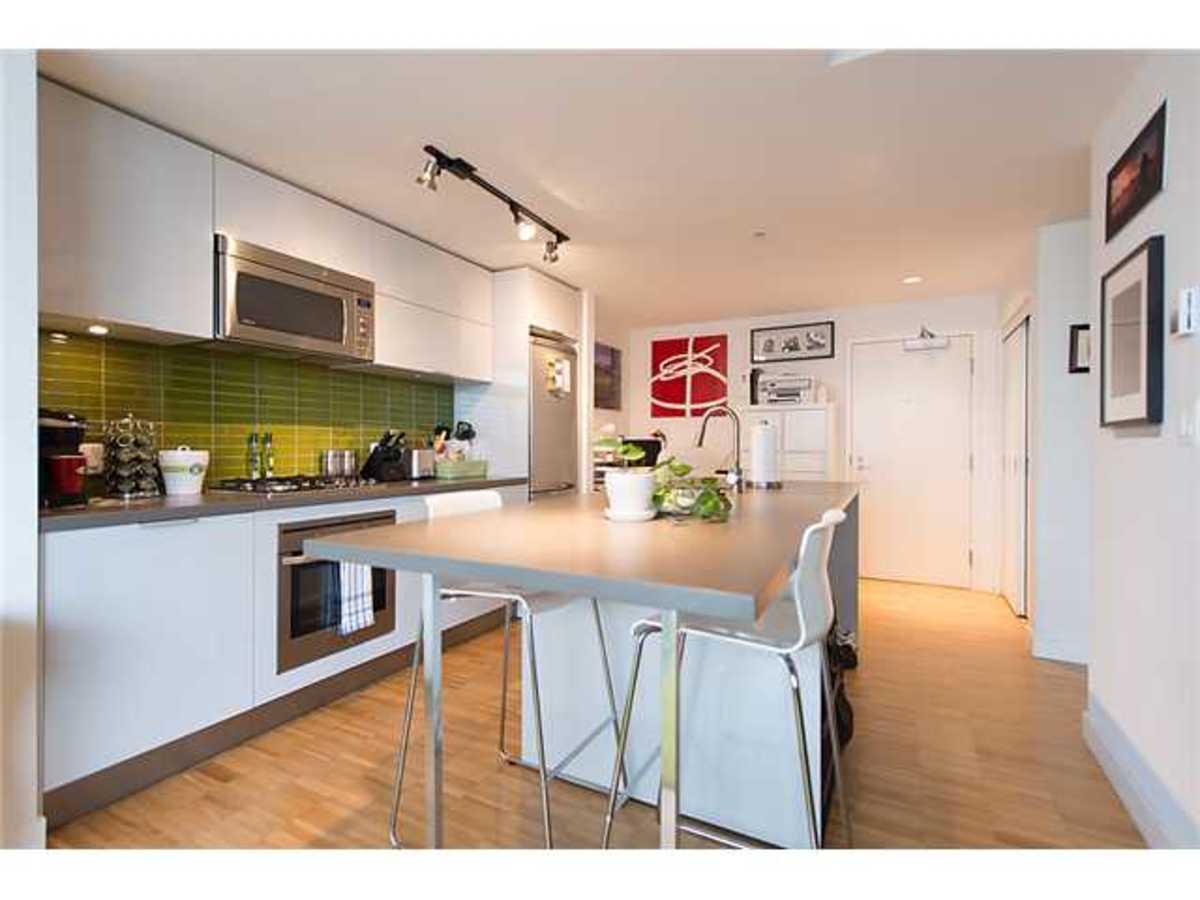 Enjoy stunning views to the North (Burrard Inlet & North Shore Mtns) and South (Open, Urban, City view) from this sub sub penthouse suite at Woodward's. This sophisticated & modern home features a European kitchen with S/S appliances, stonecountertop, Eggersman cabinets & glass tile backsplash. Amazing open floor plan, with 9' exposed concrete ceilings, h/w floors, large kitchen island, nook/work space and a large balcony that spans the entire length of the suite. Spa-like bath with stone counter, separate shower stall and soaker tub. World-class rooftop amenities include lounge, hot tub, gym, rock climbing & more. 24 hrs concierge. Steps to Nesters, Gastown and all the best dining, shopping & entertaining the city has to offer.