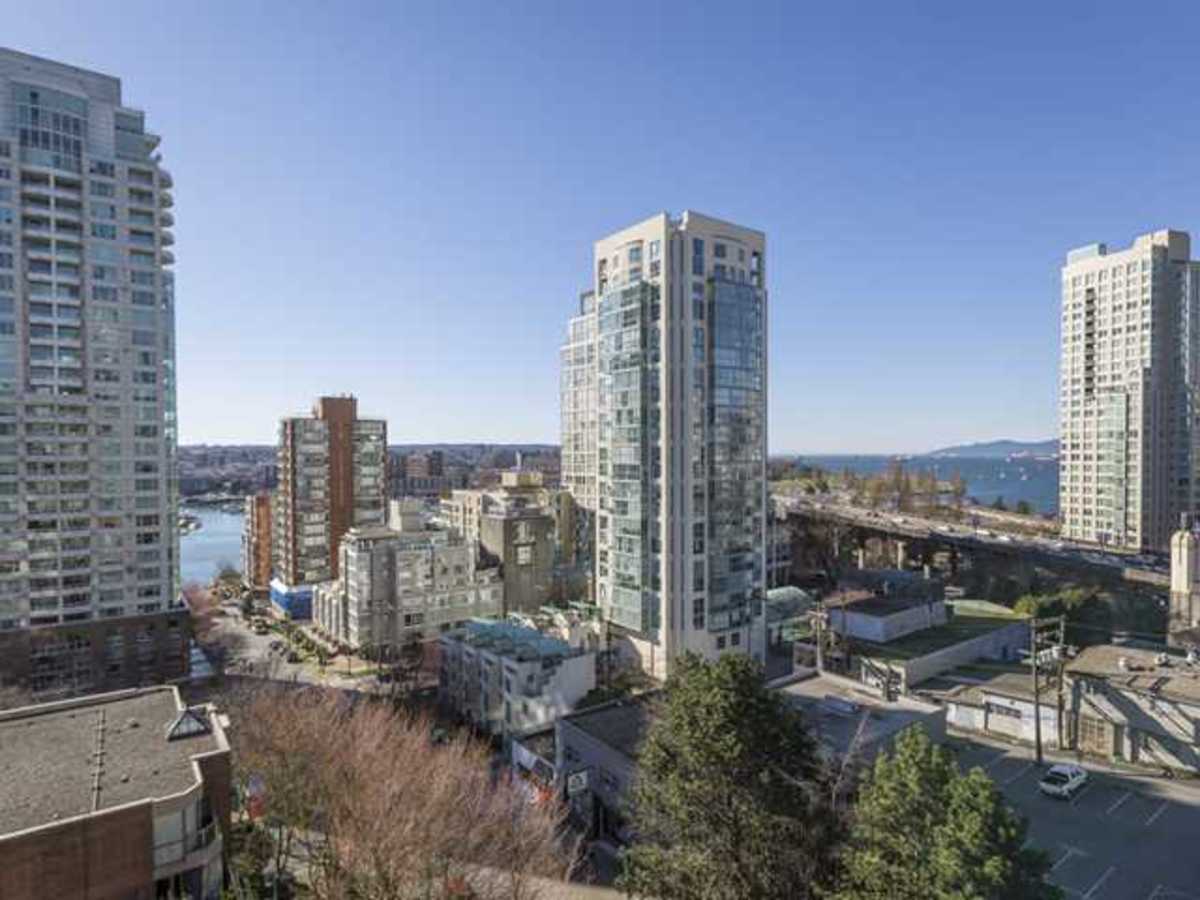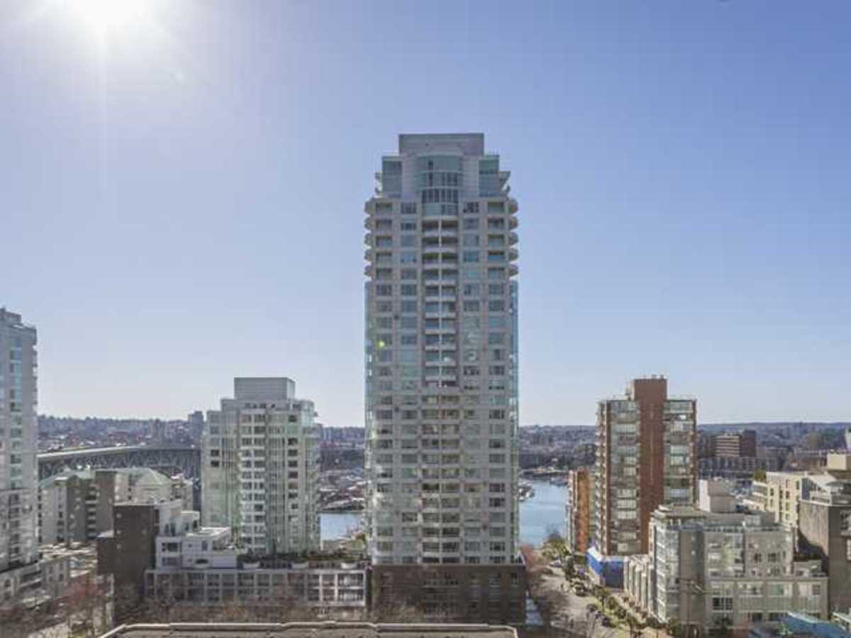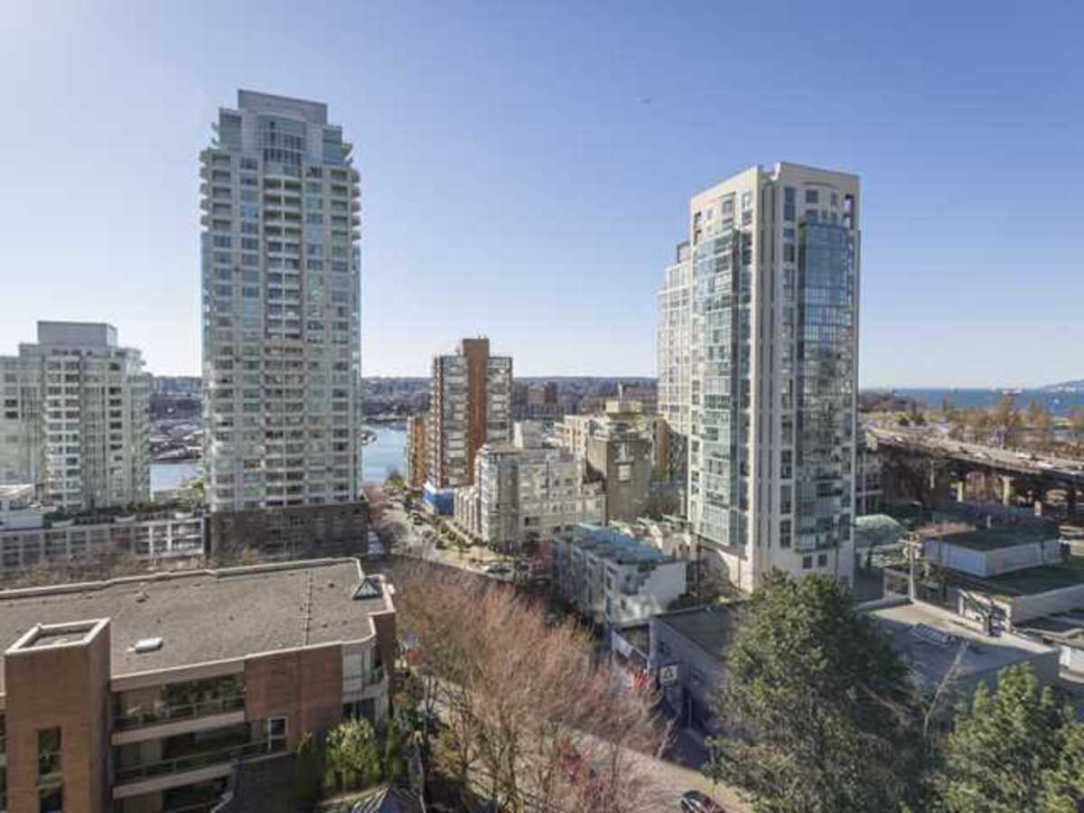 PACIFIC PROMENADE: 2 bedroom, 2 bath of 882 SF offers in suite storage easily converted to a computer office. This SOUTHWEST corner suite offers partial water views from False Creek to English Bay. Light filled suite provides floor to ceiling windows, neutral carpet throughout, kitchen with West facing picture window, open South exposed BBQ balcony and sizeable ensuite bedrooms, well positioned for privacy. Functional layout also features spacious dining area currently used as a home office. Pet friendly building, rentals permitted. 1 secure parking and storage locker included. Fabulous location, a short walk to the Beach or Downtown and steps to the ferry boat to Granville Island.